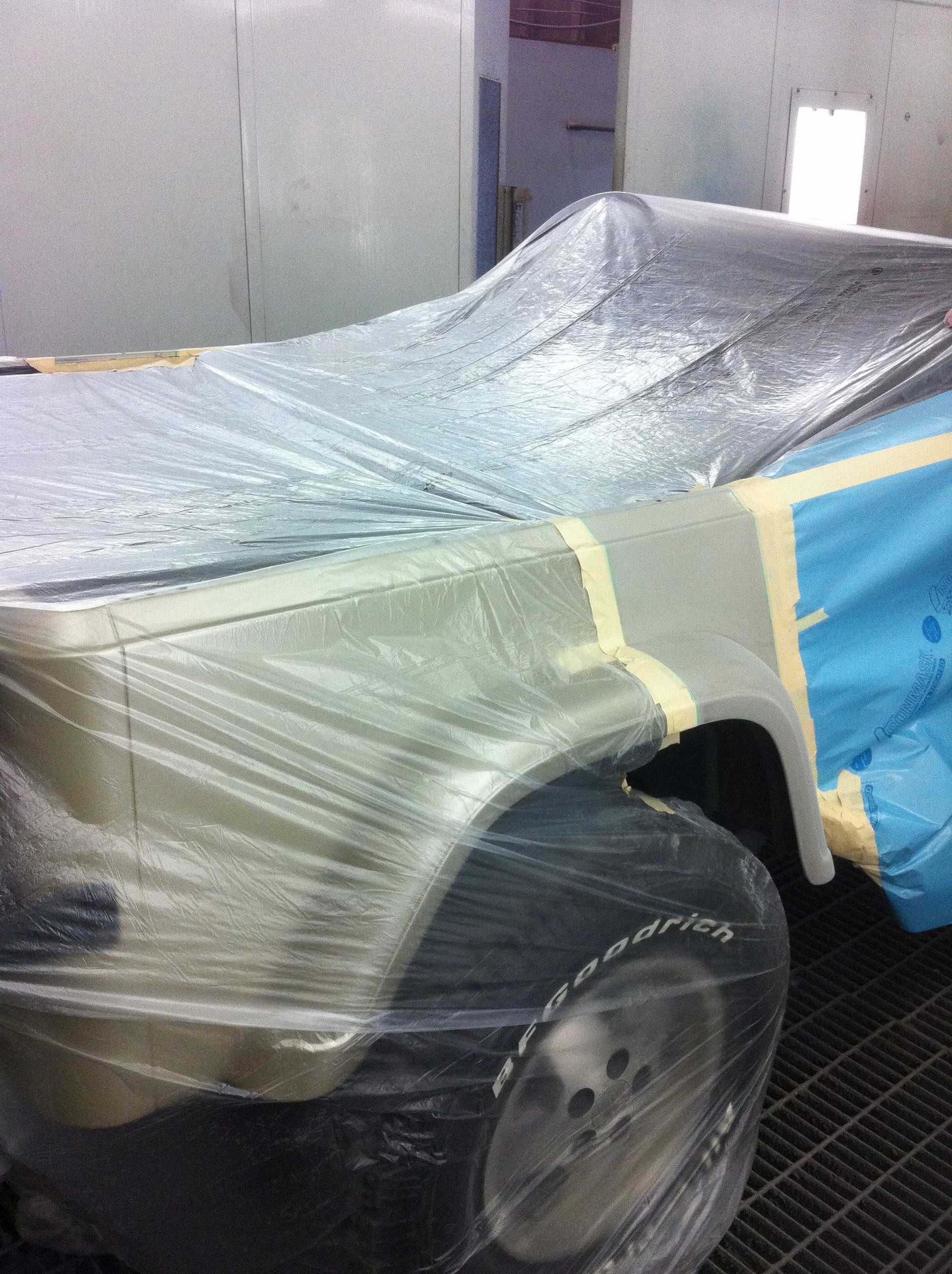 Day 2, fender and hood stencil applied and masked off. July 10, 2011